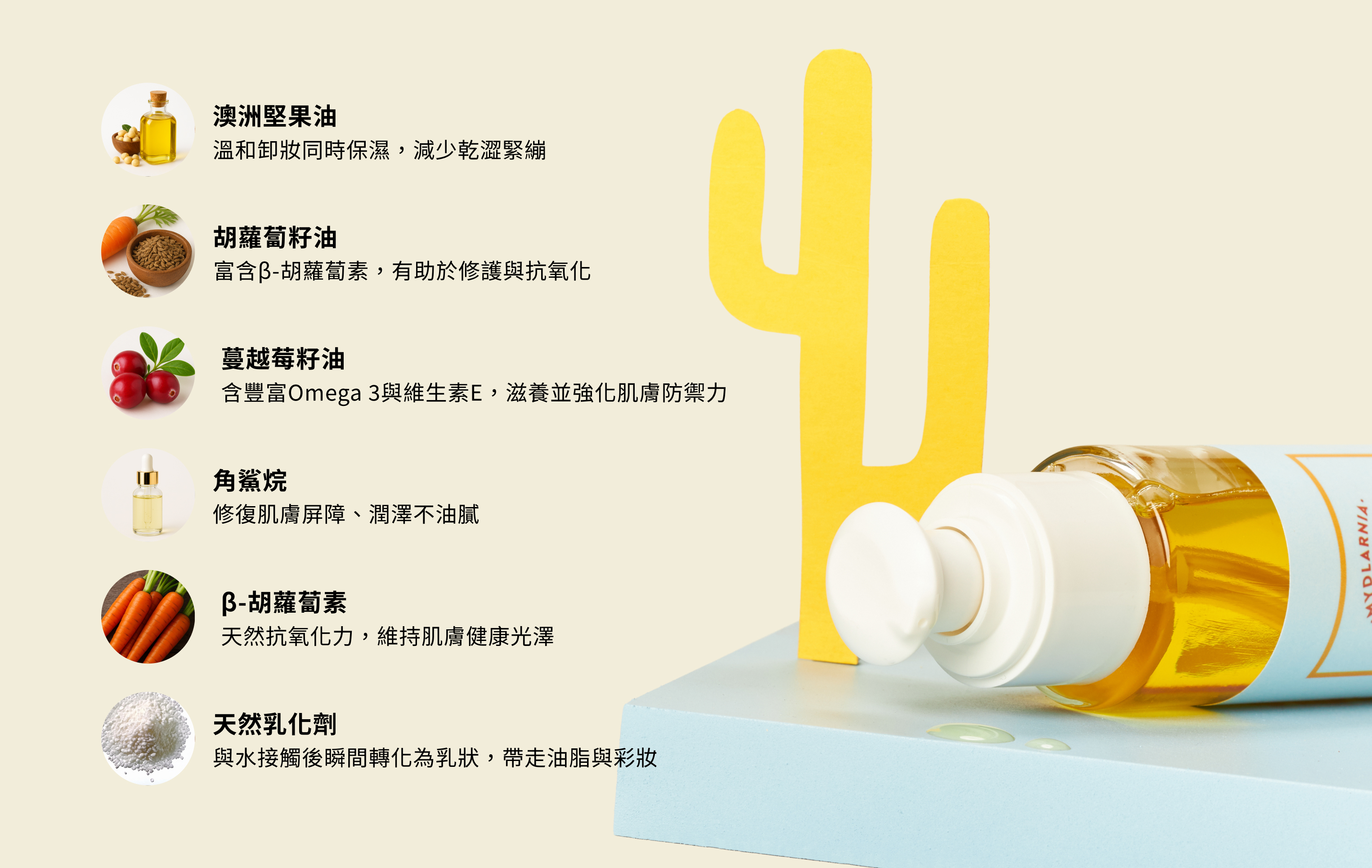 |親水配方遇水即乳化,洗後不緊繃、不油膩