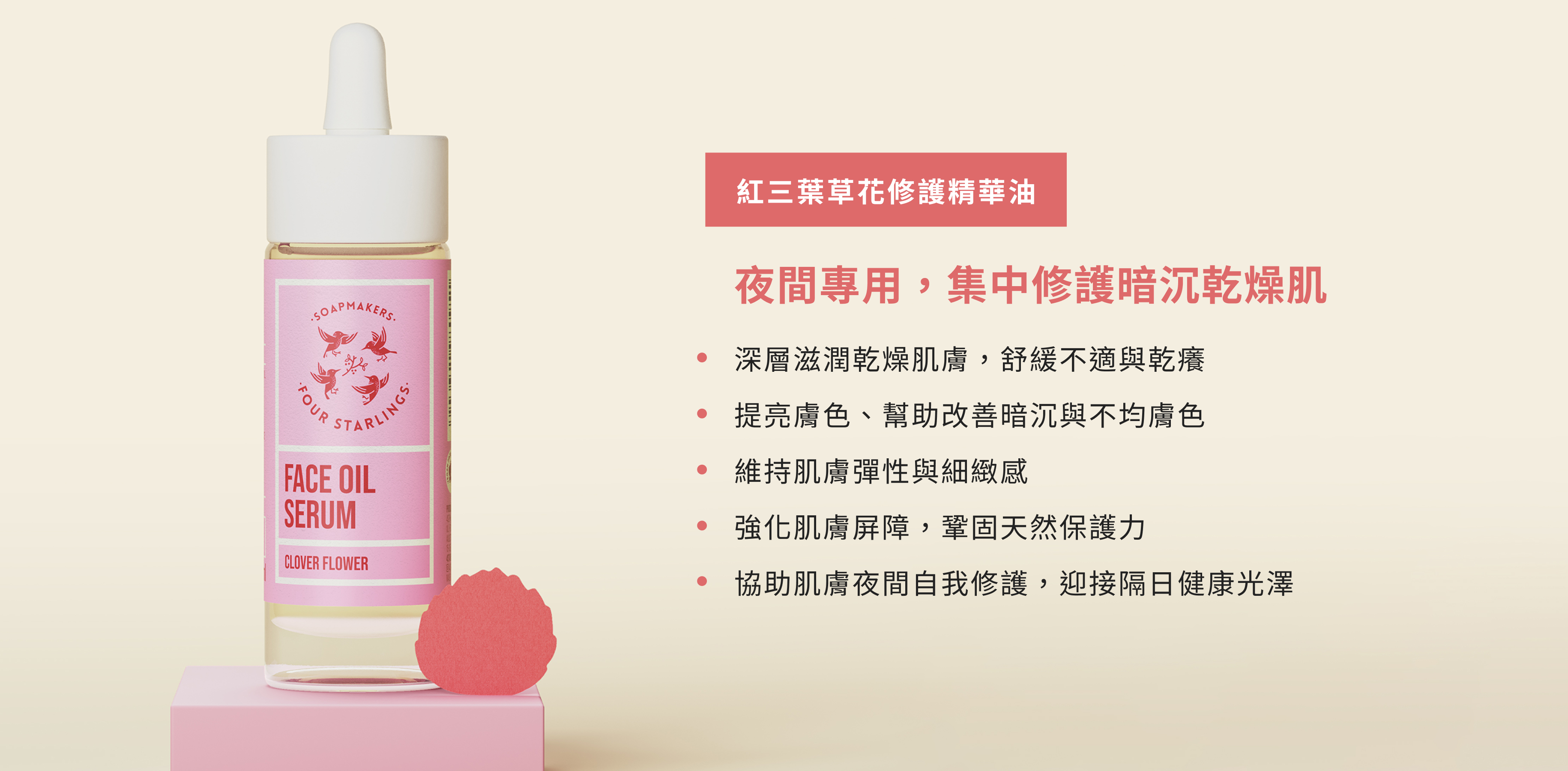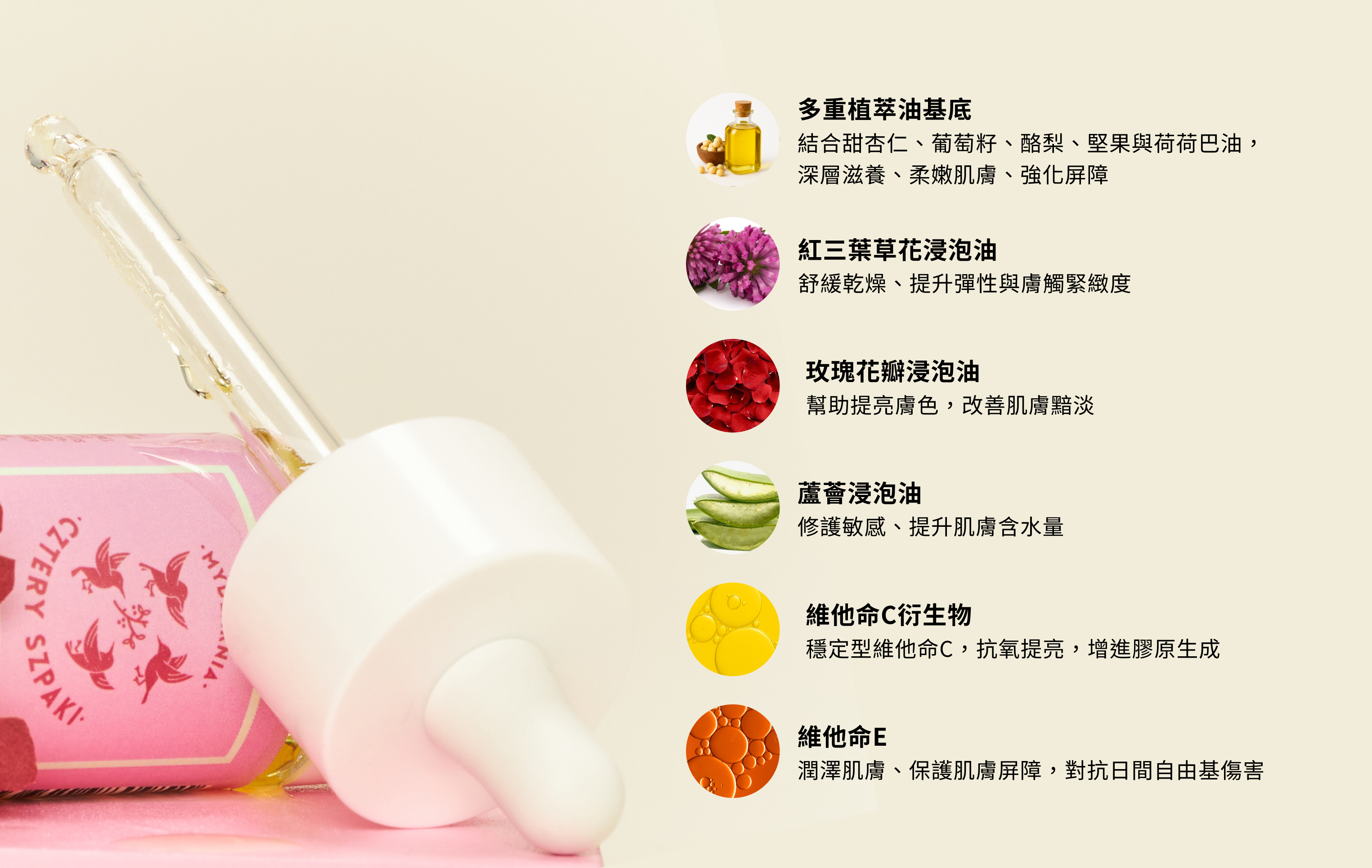|蘊含紅三葉草花與維他命C,幫助提亮膚色、撫平細紋、提升彈性